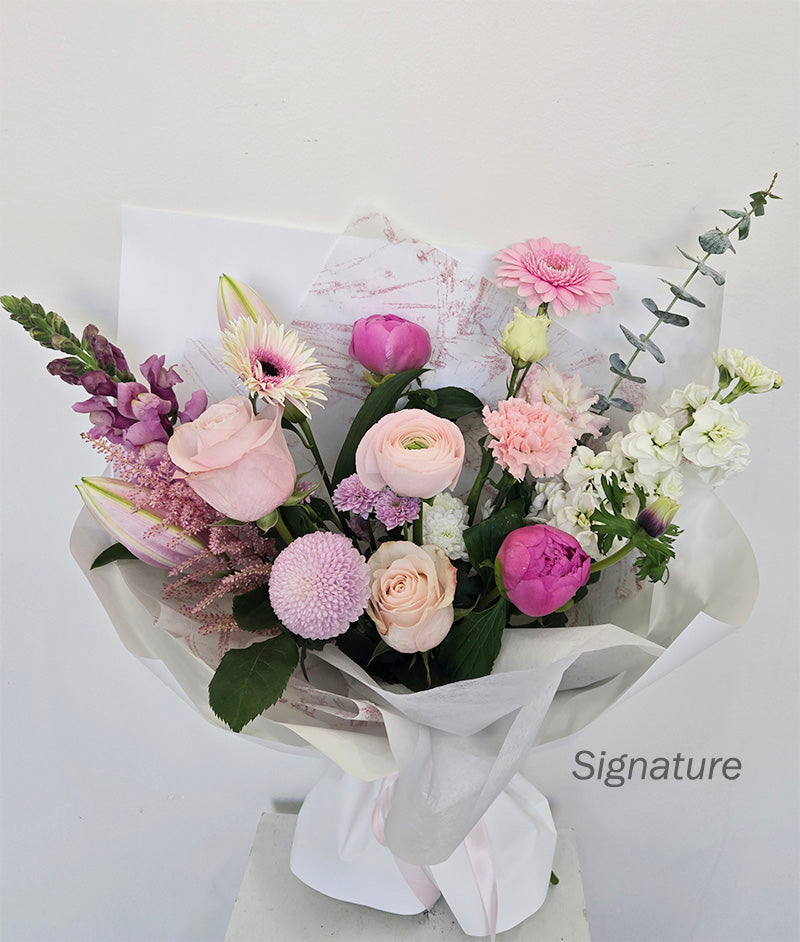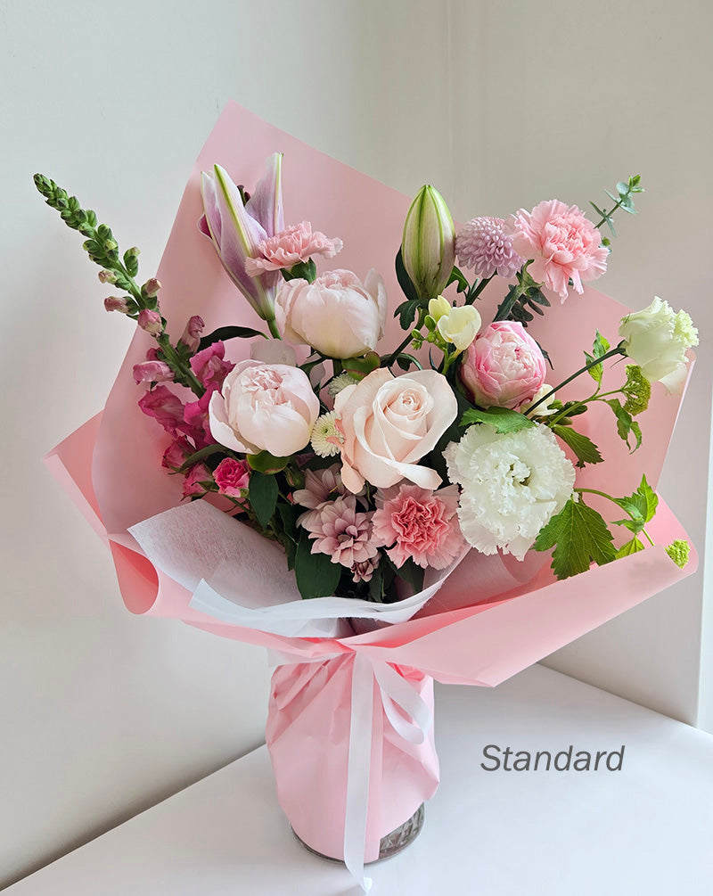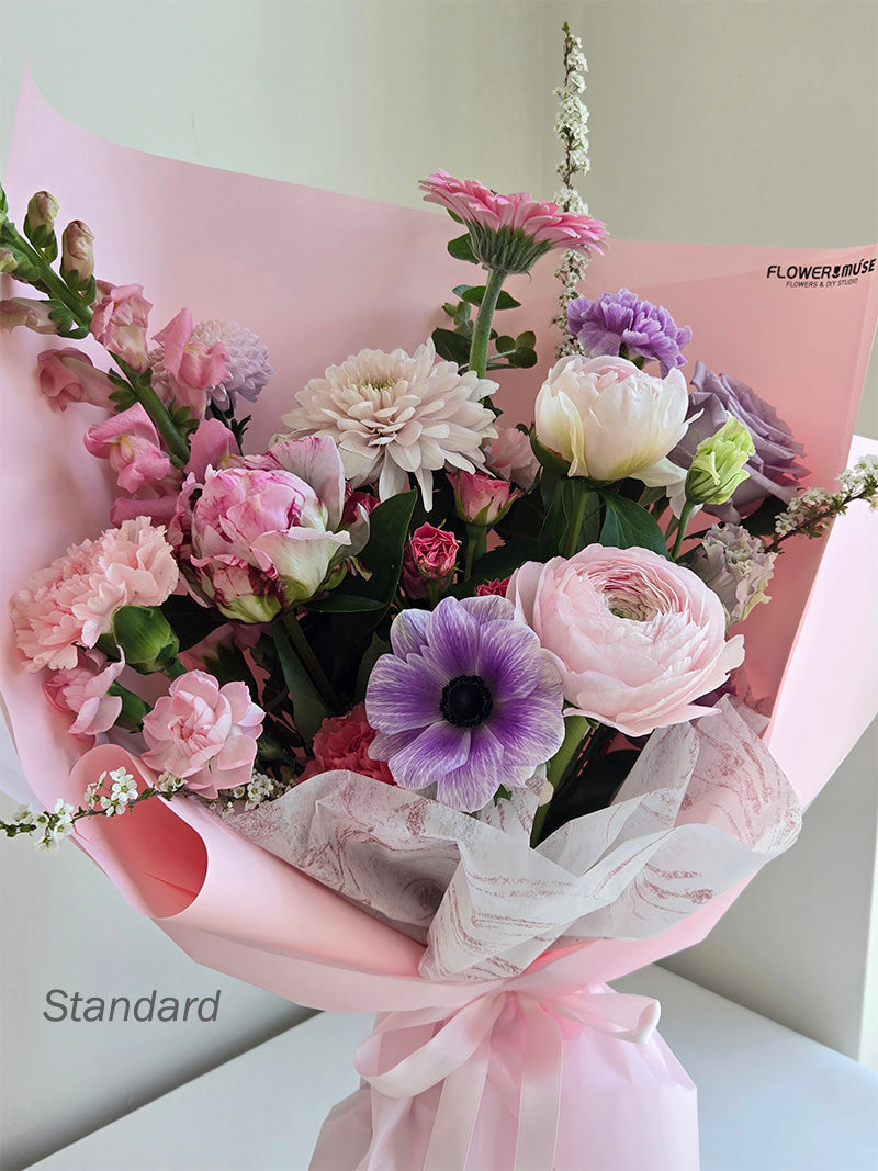 A delicate bouquet designed in soft blush pinks and gentle lavender tones, featuring lush peonies and a curated selection of premium seasonal blooms.
